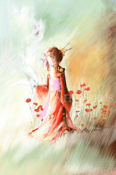 Now I have come up for air I thought I better show what I have been up to, reworking My Japanese fairy only she isn't a fairy anymore. She is more of a dove taming girl. I really need to get some better titles for my stuff, I once did a huge painting of a lots of fruit and called it 'The fruit painting' inspired!